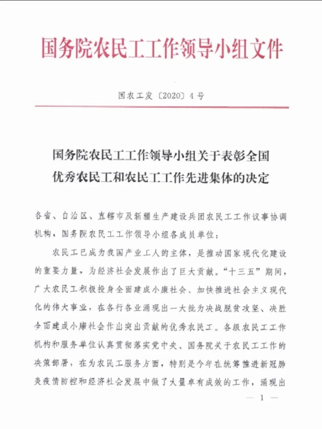 文件指出 :農(nóng)民工已成為我國(guó)產(chǎn)業(yè)工人的主體,是推動(dòng)國(guó)家現(xiàn)代化建設(shè)的重要力量,為經(jīng)濟(jì)社會(huì)發(fā)展作出了巨大貢獻(xiàn)。“十三五”期間,廣大農(nóng)民工積極投身全面建成小康社會(huì)、加快推進(jìn)社會(huì)主義現(xiàn)代化的偉大事業(yè),在各行各業(yè)涌現(xiàn)出一大批為決戰(zhàn)脫貧攻堅(jiān)、決勝全面建成小康社會(huì)作出突出貢獻(xiàn)的優(yōu)秀農(nóng)民工。各級(jí)農(nóng)民工工作機(jī)構(gòu)和服務(wù)單位認(rèn)真貫徹落實(shí)黨中央、國(guó)務(wù)院關(guān)于農(nóng)民工工作的決策部署,在為農(nóng)民工服務(wù)方面,特別是今年在統(tǒng)籌推進(jìn)新冠肺炎疫情防控和經(jīng)濟(jì)社會(huì)發(fā)展中做了大量卓有成效的工作,涌現(xiàn)出一大批取得顯著成績(jī)的先進(jìn)集體。